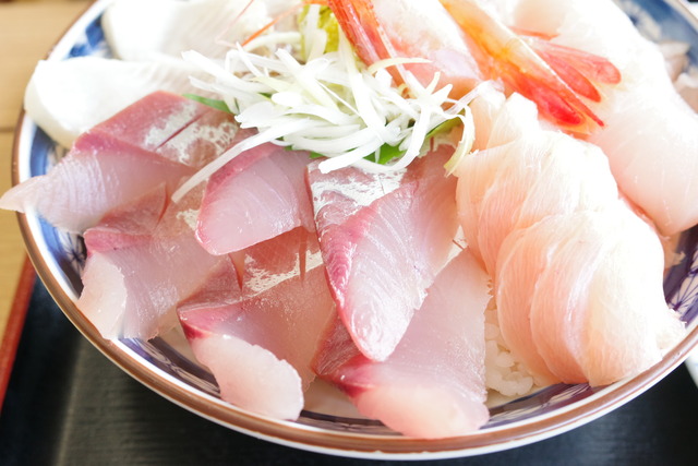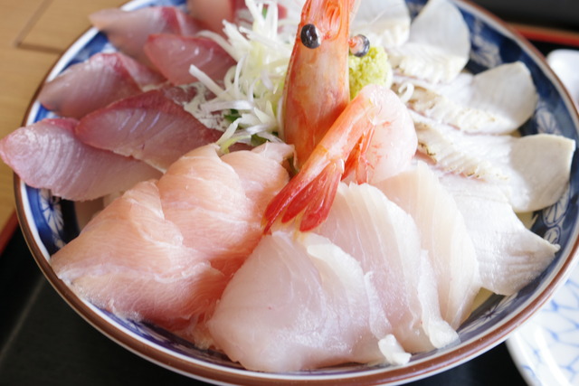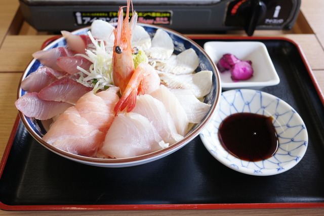 そして主役の氷見浜丼。丼ぶりの上には鯛、ヒラメ、サワラ、甘エビ、そして赤身。鰤こそないものの、脂の旬が異なる魚種を組み合わせたラインナップで、その日の氷見を表現したような盛り付けです。