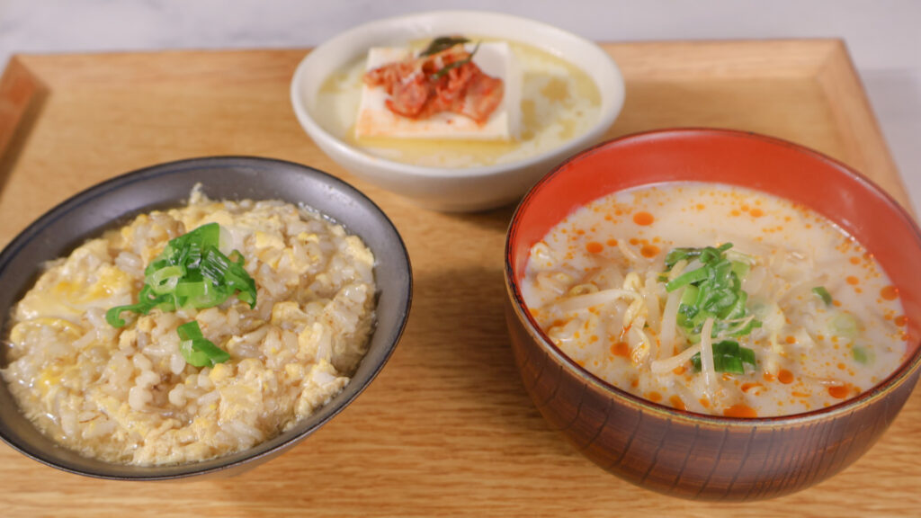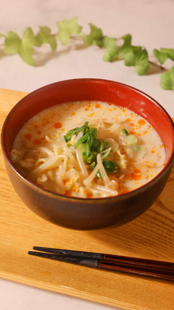 - ねぎをのせ、お好みでラー油を加える。※豆乳は分離しやすいため、沸騰させないよう注意します。