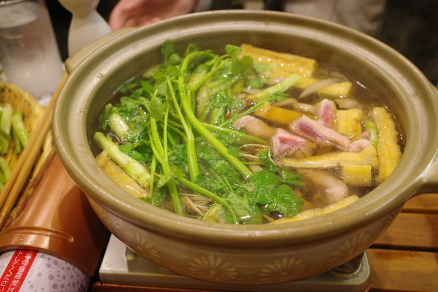 グツグツと煮立ち始めた出汁の中に、まずは鴨もも肉、立派なせりの根っこ、油揚げが投入されます。そして最後に、鮮やかなグリーンのせりの茎と葉が加えられ、鍋の中は一気に華やかに。