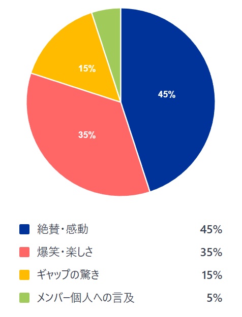 いずれにしても、今回のSnow Manのパフォーマンスに対し、喜び、楽しむ非常にポジティブ反応であふれており、コメントからも国民的な人気ぶりが読み取れました。