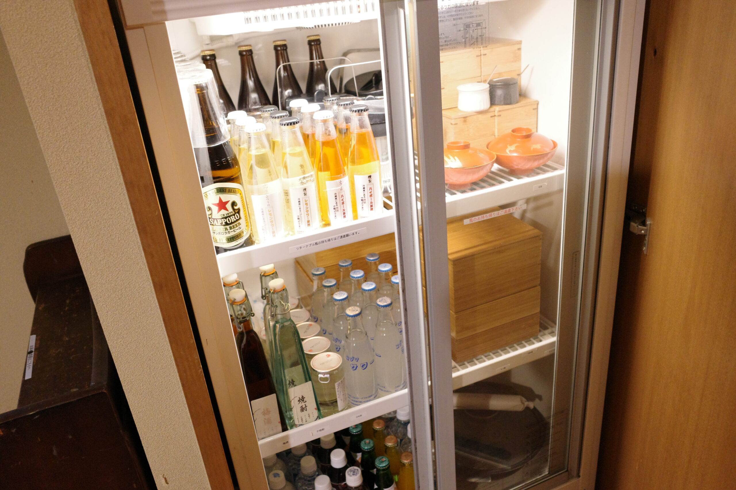 お部屋に入ってまず驚くのが、備え付けの冷蔵庫。 「ご自由にどうぞ」スタイルなんですが、そのラインナップがすごいんです。