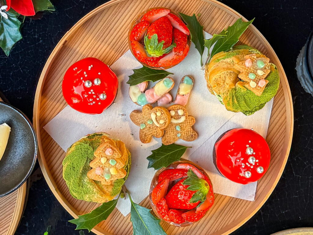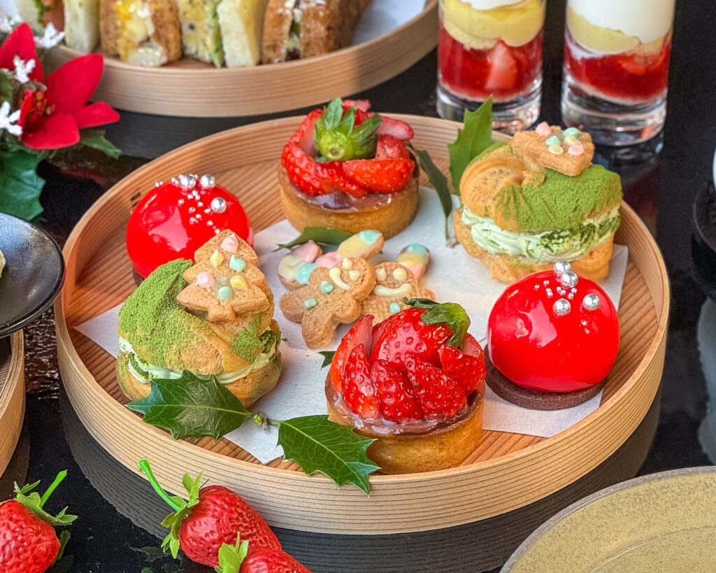 12月からスタートしたアフタヌーンティーは旬の苺や艶々で細やかな泡も表現されたシャンパンムース、冬の味覚満載でクリスマス仕様のパリブレストなど、見た目も華やかで、お味も上品で洗練されたペストリーがずらりと並びます。