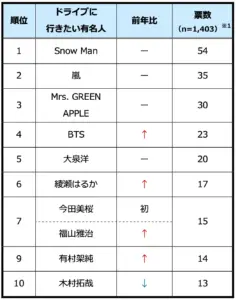 それによると、一緒にドライブに行きたい有名人に関する調査で、9人組男性のグループのSnow Manが2年連続で首位に輝きました。