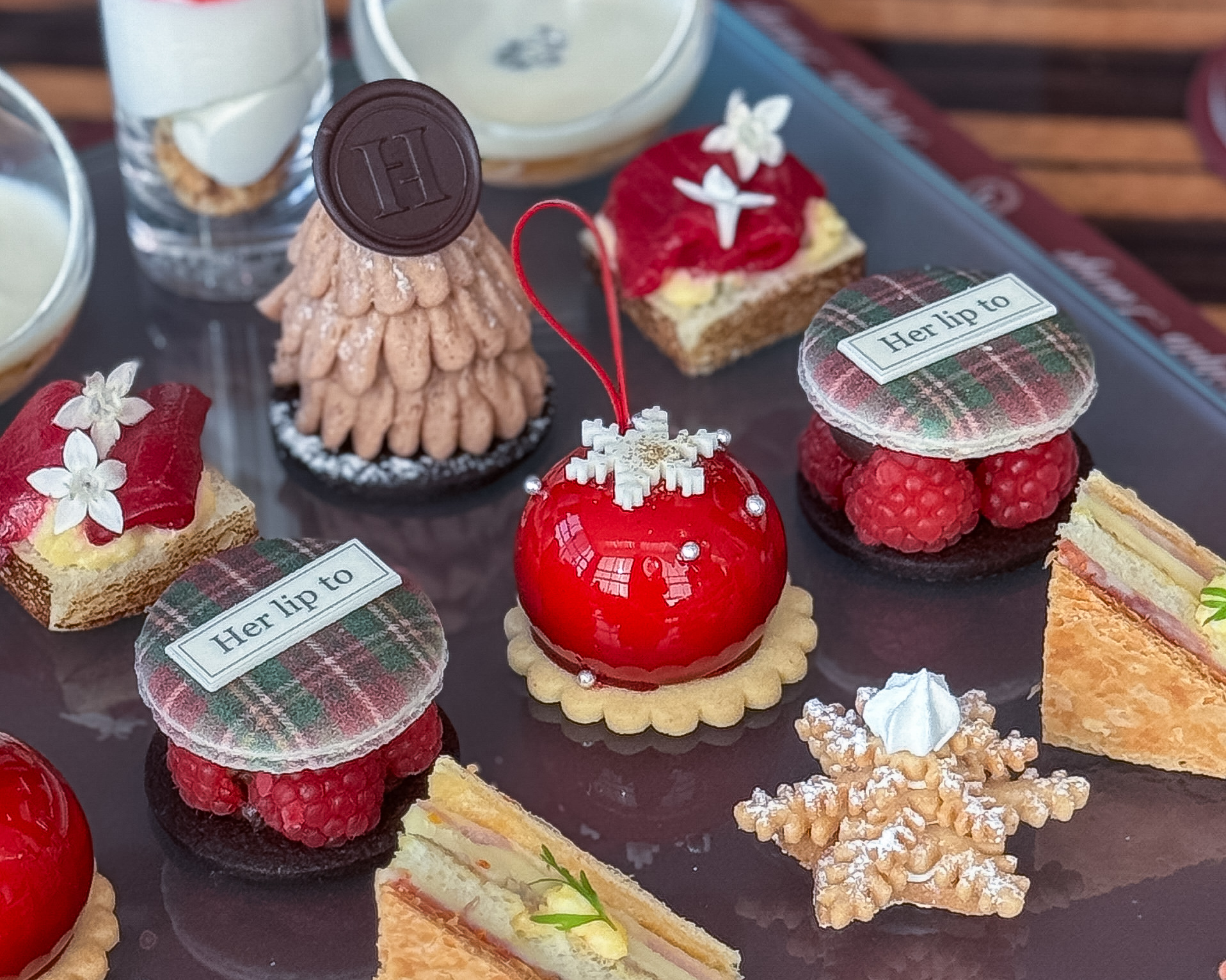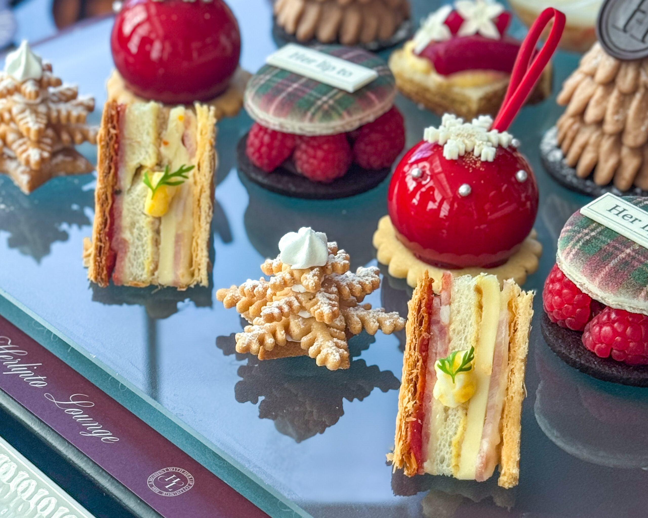 オーナメントはアールグレイのムースなので、優しい甘さで後口スッキリ。 セイボリーも趣向を凝らしたお料理。「ゴーダチーズとジャンボンブランのミルフィーユサンド」は約10種食材が重なり、サクサクのパイ生地でサンドされた、味わいのハーモニーや食感を楽しむ一品。