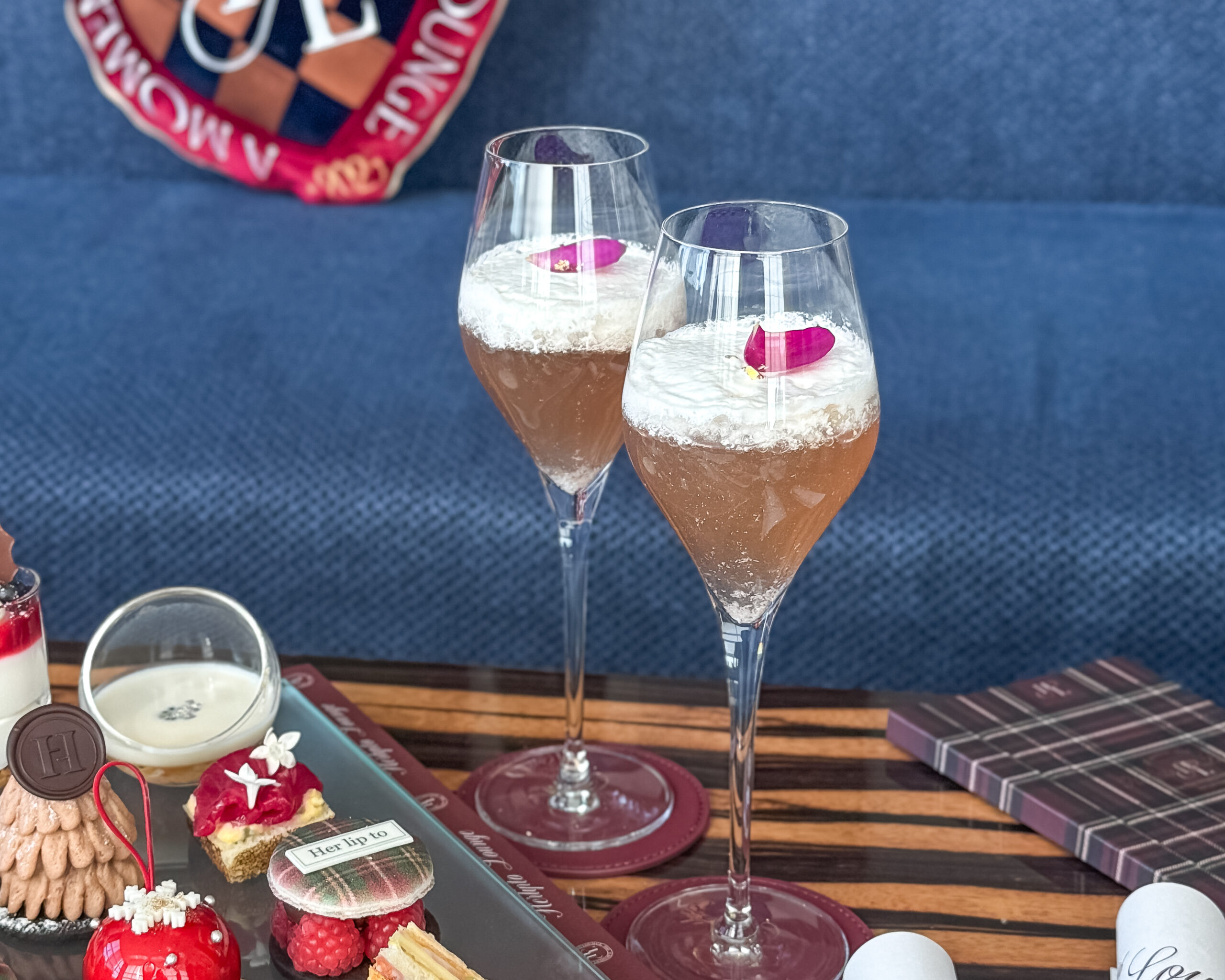 元AKB48の小嶋陽菜さんがプロデュースするライフスタイルブランド「Her lip to」とのコラボアフタヌーンティーです。薔薇のエスプーマをトッピングしたウエルカムドリンクのカクテルからスタート。