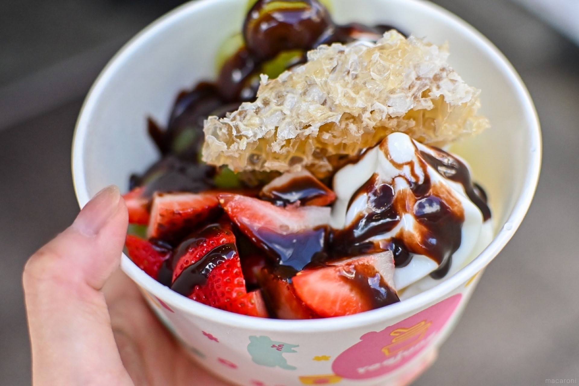 フローズンヨーグルトにフルーツや蜂の巣をのせて楽しむ韓国発スイーツ。