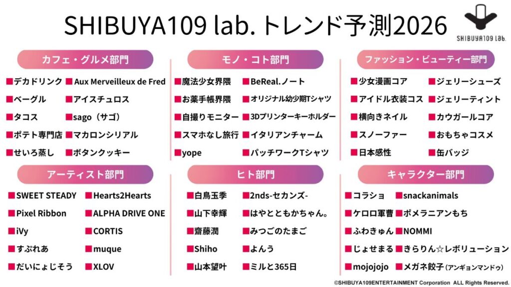 今年の「SHIBUYA109 lab.トレンド予測2026」では6部門を対象にトレンドを予測しました。6部門は「カフェ・グルメ」「モノ・コト」「ファッション・ビューティー」「アーティスト」「ヒト」「キャラクター」です。
