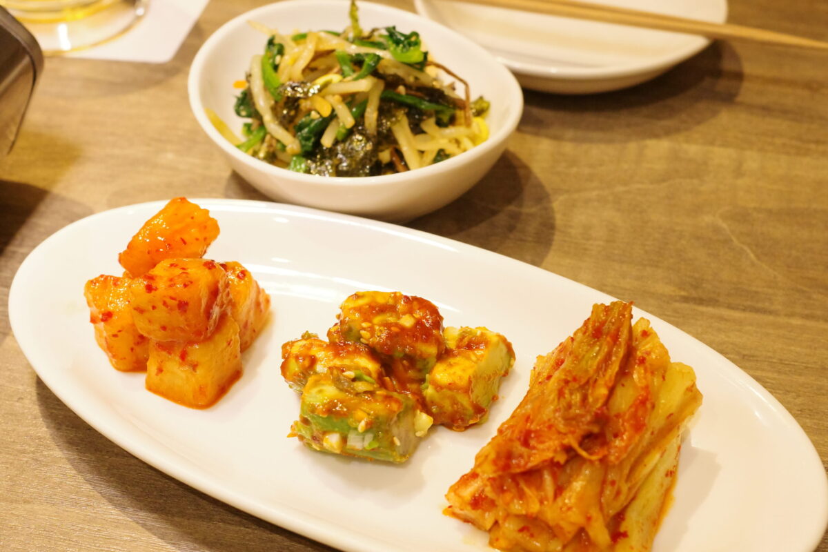 席に着いて、まずは前菜たちがお出迎え。 「キムチ盛り合わせ」と「混ぜナムル」。これがまた、お酒が進む絶妙な味付けでクセになります。