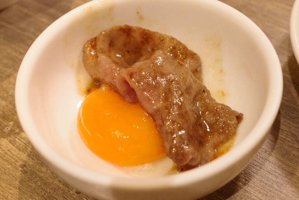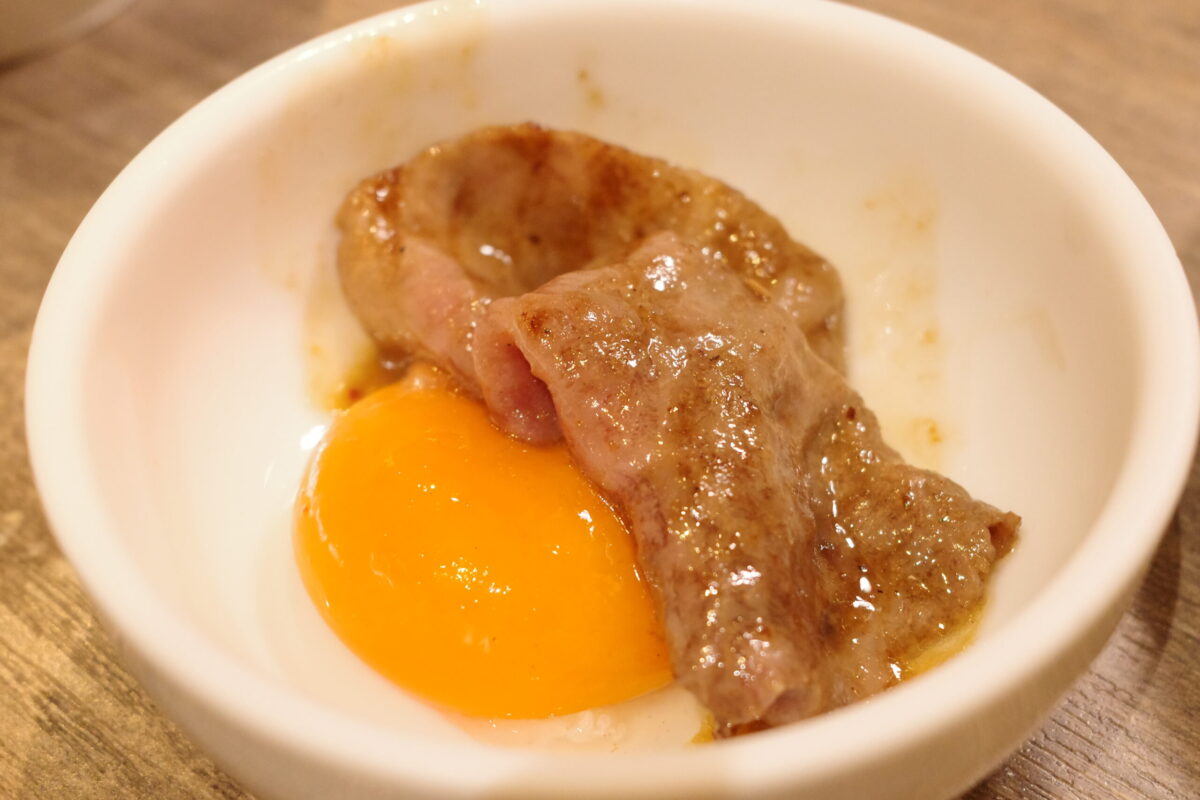 ほんのり色が変わり、脂が溶け出した最高のタイミングで濃厚な卵黄にくぐらせて、パクリ。口の中でとろける食感、タレのコク、そして卵のまろやかさが三位一体となって押し寄せてきます。