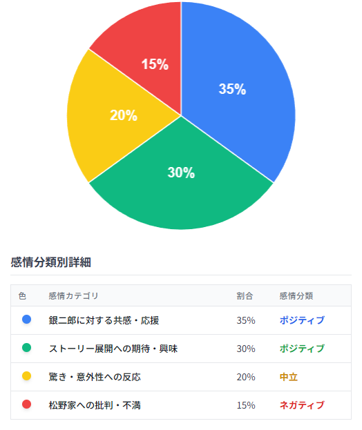 SNS上のコメントを見ると、立派な姿に成長しておトキちゃんを迎えにきた銀二郎さんに対する反応が目立ちます。具体的には銀二郎さんの優しさやカッコよさを称賛し、応援する声が多く「銀二郎さん立派になられて」「銀二郎さん、優しいな〜」「銀二郎さんやっぱり全てに置いていい男だったんだねー」「銀二郎さん男前〜」などのコメントが多く見られました。