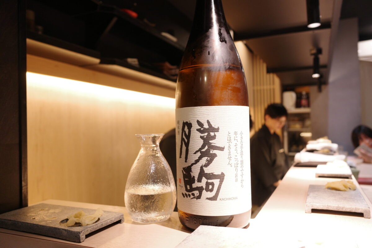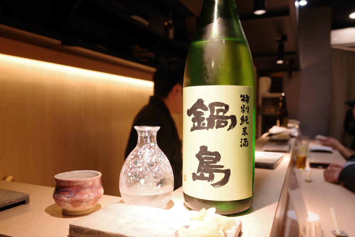 お酒はもちろん日本酒をオーダー。大将におまかせでお願いすると、佐賀県の銘酒「鍋島」を出してくれました。フルーティーな香りがお鮨に寄り添います。