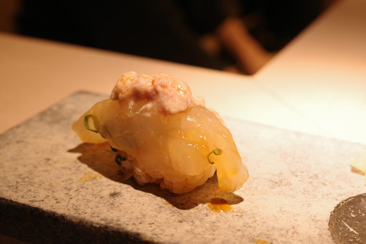 カワハギです。 濃厚な肝が乗っていて、淡白な白身と肝のコクが口の中で一体に。 これはもう、日本酒が進まないわけがありません!
