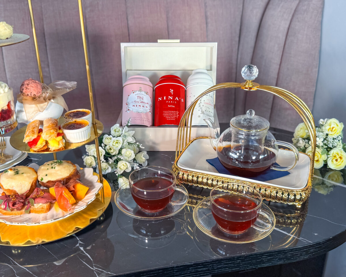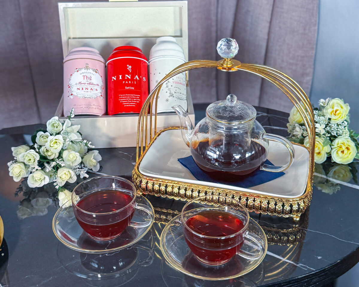 紅茶は、フランス王妃マリーアントワネットが愛したと言われる「フレンチ・ロイヤルティー」。希少なりんごとバラで香りづけたフランス老舗紅茶「ニナス」の上質で華やかなアロマが広がるフレンチ・ロイヤルティーがセットで楽しめます。