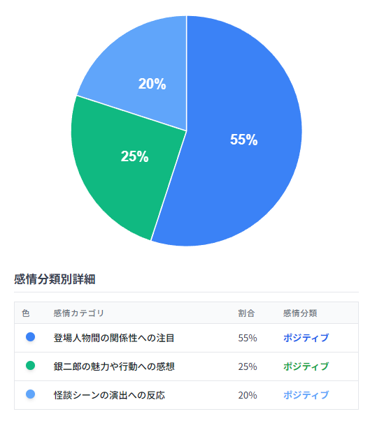 一方、おトキとヘブン先生が怪談に夢中になる一方、銀二郎さんとイライザさんが疎外感を感じている状況に対する視聴者の反応も多く見られました。「イライザさん、ヘブン先生の変化に気づいた感じですね。銀二郎さんもこの2人の関係は?と疑ってることでしょう…」「イライザさんと銀二郎さんは蚊帳の外」「みんなそれぞれに違う思いで、あたあたしてる」「おトキちゃんとヘブンさんはすっかり怪談の世界に没入」など2組のカップルの対照的な様子や、怪談の場での雰囲気、とりわけヘブン先生の食いつきの良さに言及する声が多く、互いの関係性の変化や気まずさを指摘するコメントが目立ちました。