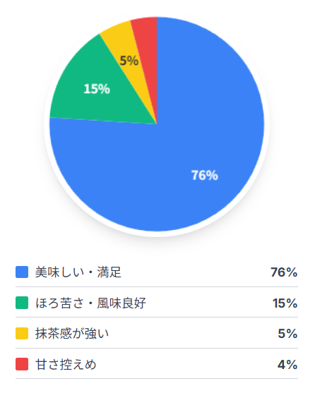 全体的に甘すぎず本格的な香りが楽しめる抹茶好きにはたまらない「自分へのご褒美」として圧倒的な支持を集める結果となりました。