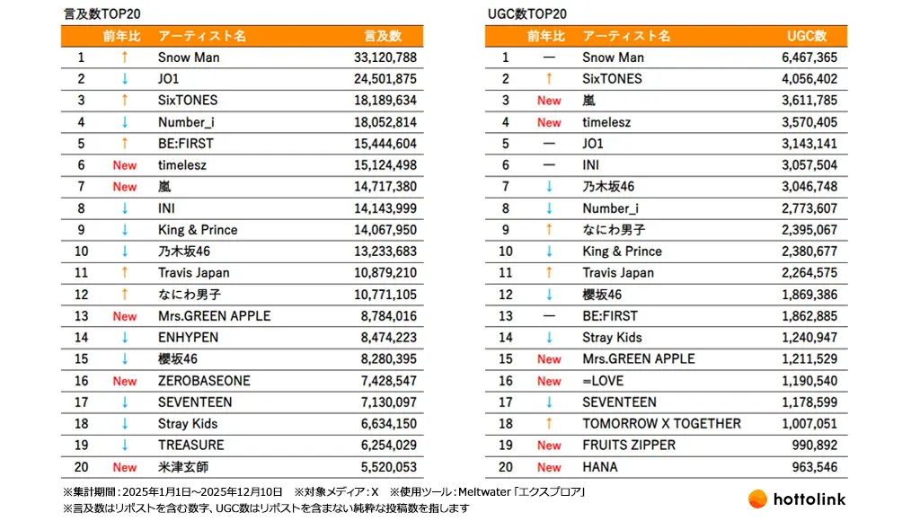 SNSマーケティング支援サービスを提供するホットリンク(東京都千代田区)は26日、Xのデータを分析して、2025年に話題となったアーティストのX上での言及数に関する調査結果を発表しました。