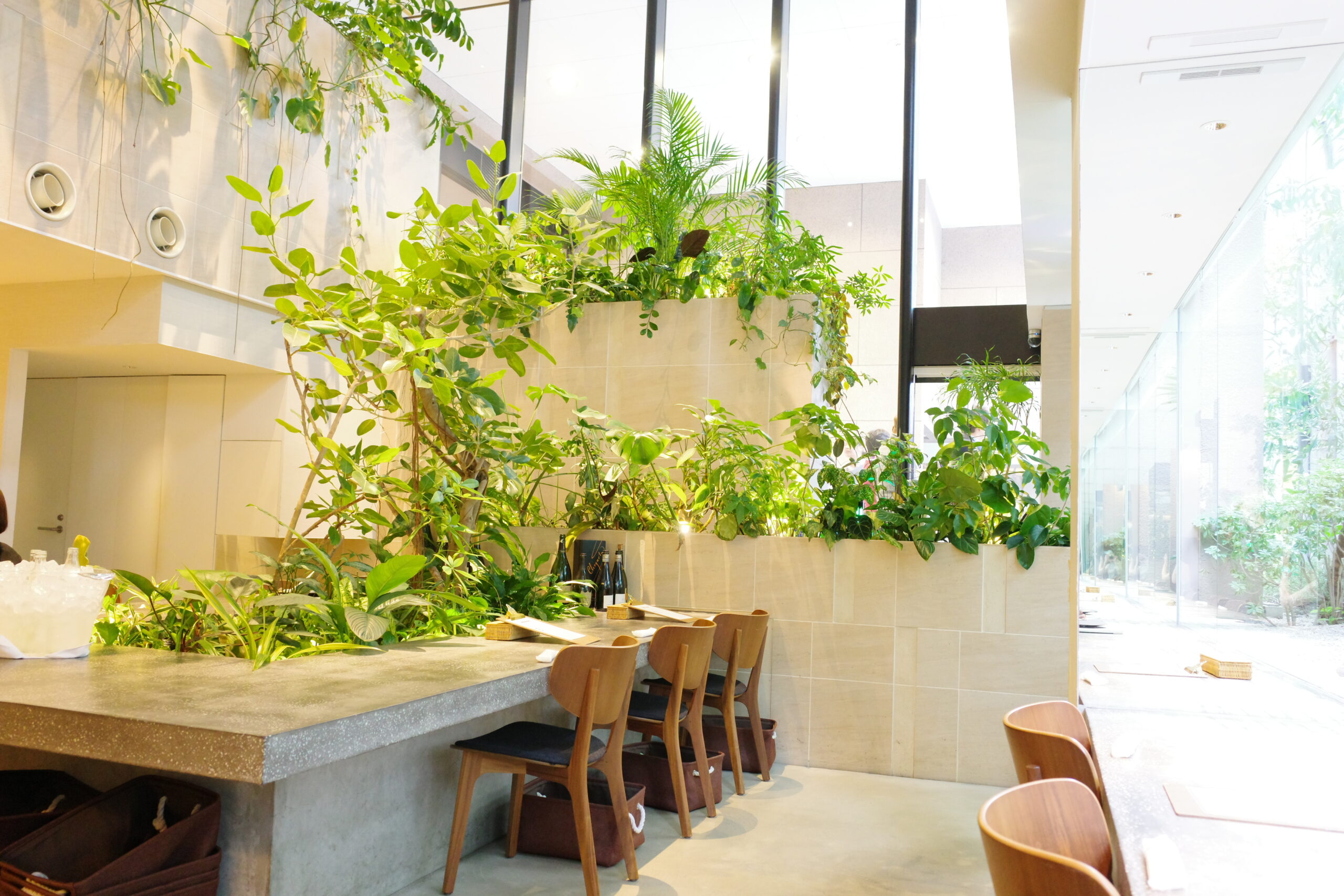 こちらのコンセプトは「延長された深緑」。その言葉通り、目の前の靭公園の豊かな緑が、そのままお店の中まで続いているような不思議な感覚になります。