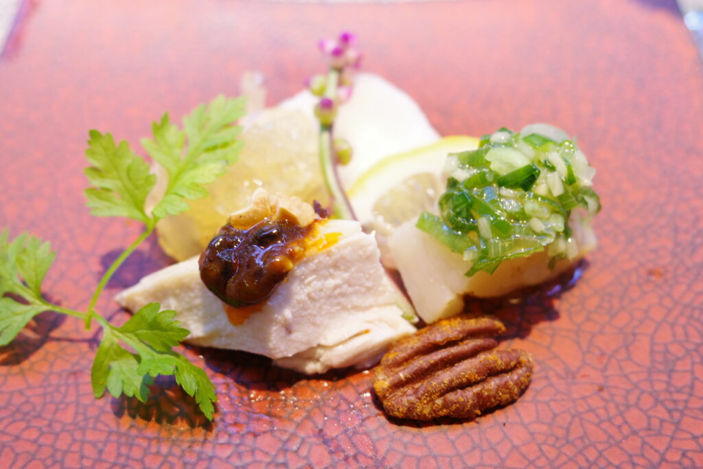 コリコリとした食感が楽しいクラゲに、しっとり柔らかく仕上げられた蒸し鶏。そして、噛むほどに甘みが広がる帆立貝。そこに添えられた大根のさっぱり感と、ピーカンナッツのカリッとした香ばしさが絶妙なアクセントになっています。