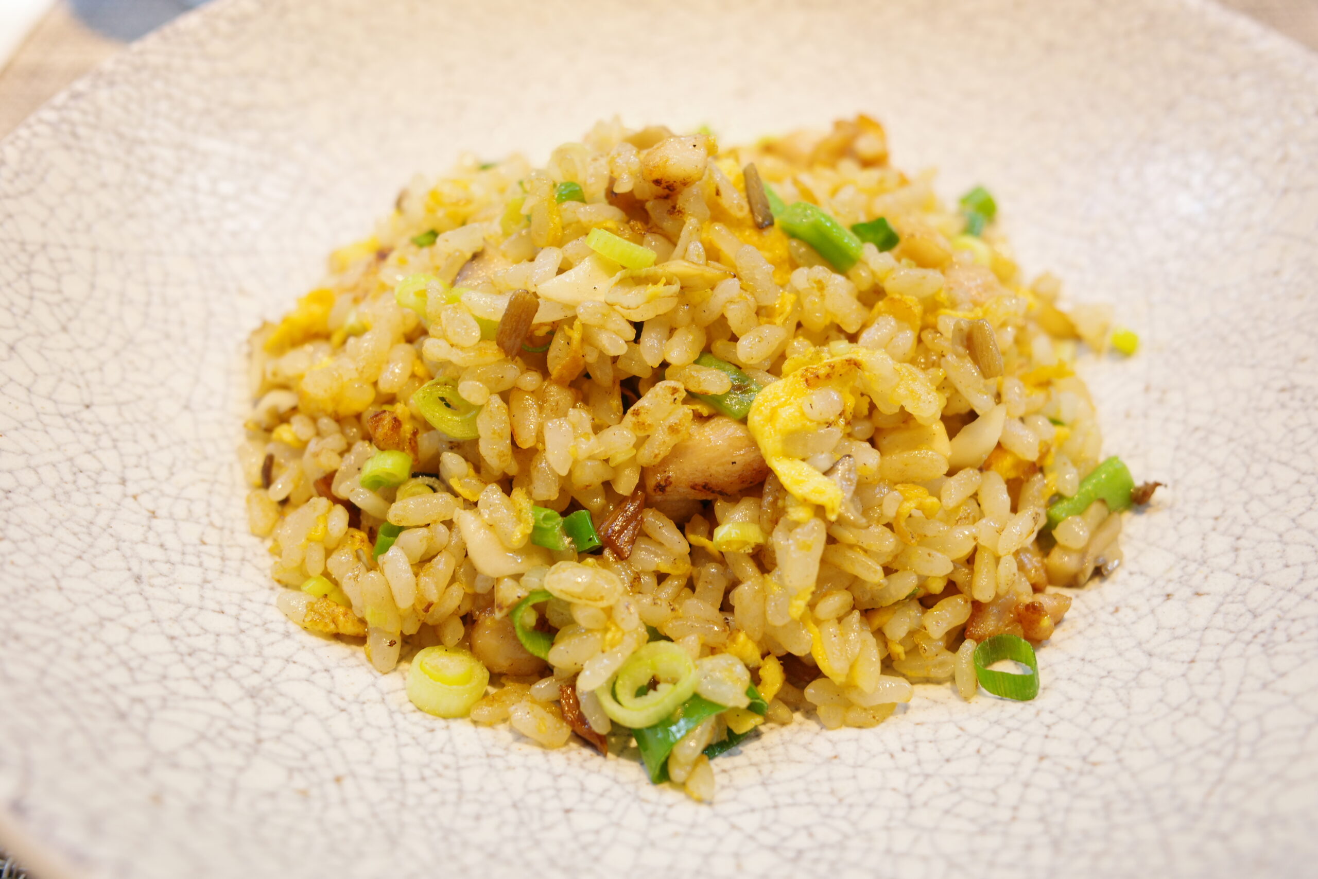 コースの締めくくりは、鶏肉とキノコのチャーハン。パラパラに炒められたご飯に、茸の芳醇な香りと鶏肉の旨味がしっかり染み込んでいます。