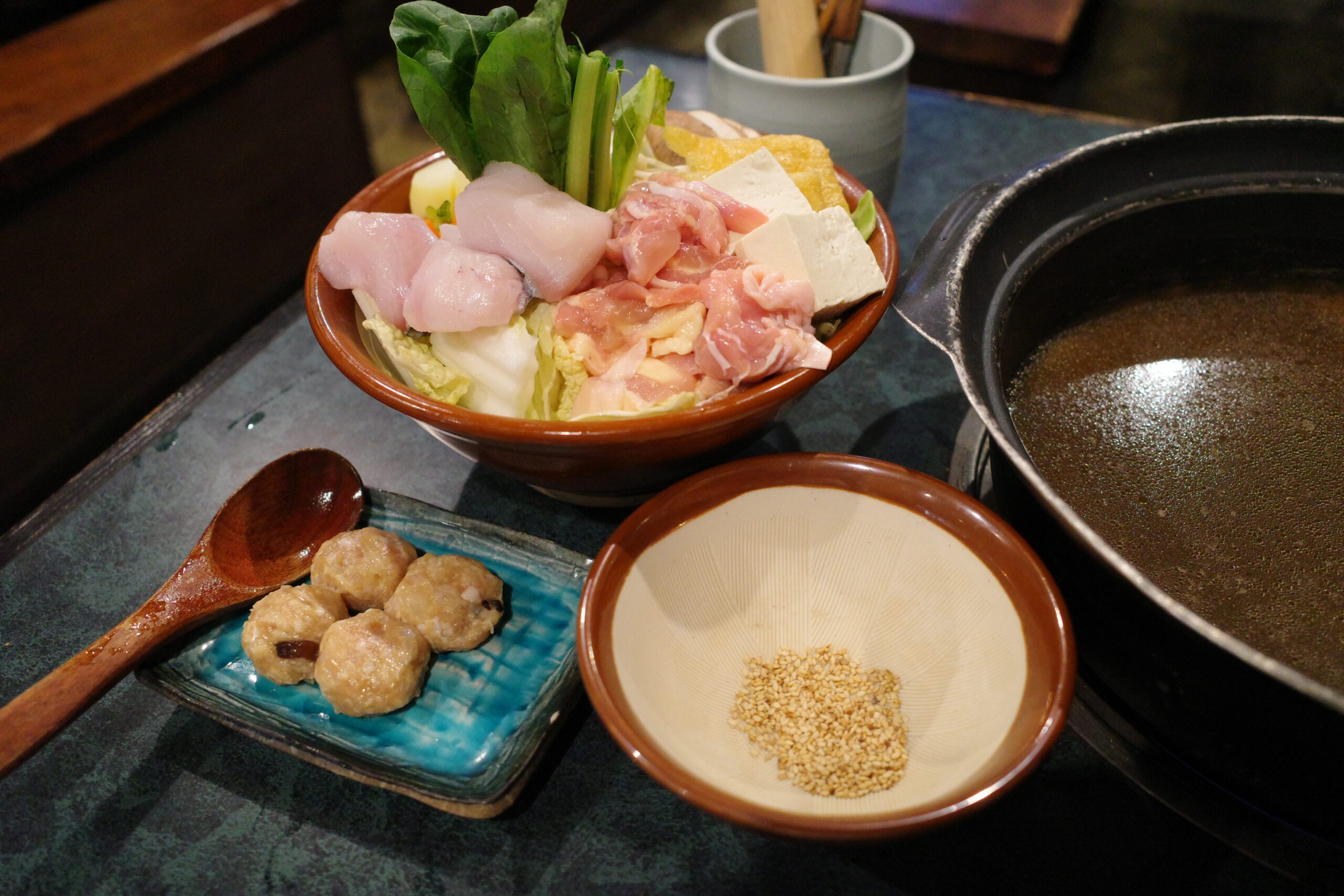 大きなすり鉢に入った具材が登場。肉団子や鱈、鶏肉、しいたけ、えのき、竹の子、じゃがいも、玉ねぎ、長ネギ、大根、人参、もやし、油揚げ、豆腐、白菜、キャベツ、小松菜など具沢山。