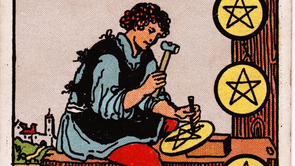 【ペンタクルの8】の正位置が出た今週は、絵柄の、前向きにコツコツと作業を続けている男性のように、自分のこれまでの取り組みが間違っていないことを実感できそう。