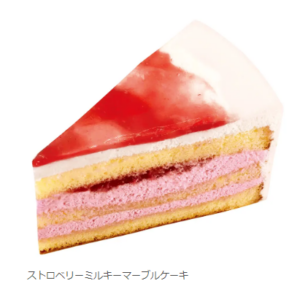 スポンジにはストロベリークリームと苺果肉入りのソースをサンド。その上に練乳入りシャンテリークリームを重ねることでミルキーの味わいを表現しているそう。上面のマーブル模様はストロベリーソースです。