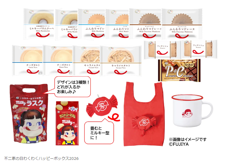 不二家洋菓子店のネット予約受付サイト「FUJIYA-Sweets.com(フジヤ スウィーツ ドットコム)」限定でミルキーバームクーヘンやカントリーマアム ミルキー味(1袋)など人気のお菓子17点と限定エコバッグやホーロー風のマグカップがセットになった「不二家の日わくわくハッピーボックス2026」が予約受付開始中となっています。