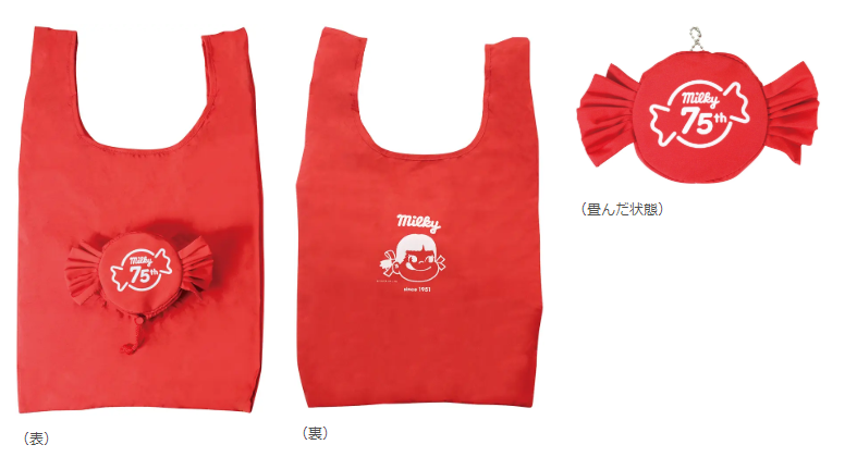 2026年はキャンディ・グミ「ミルキー」が発売されてから75周年となるため、購入条件を満たした人にプレゼントするエコバッグは「ミルキー75th」のロゴ入り。折りたたむとキャンディの形になるのが特徴です。裏面にはミルキーのロゴとペコちゃんがデザインされています。