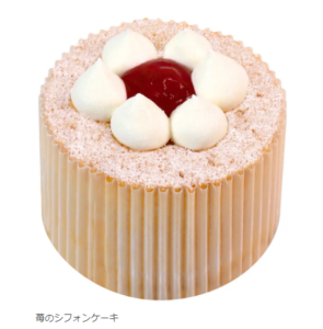 シフォンの生地には苺果肉入りの軽い食感のカスタードソースが隠れており、ケーキの上面には苺果肉ソースがトッピングされています。