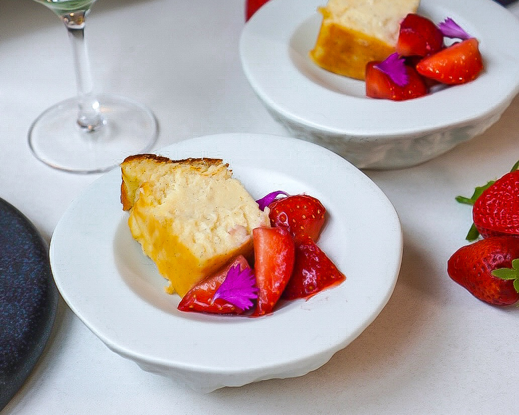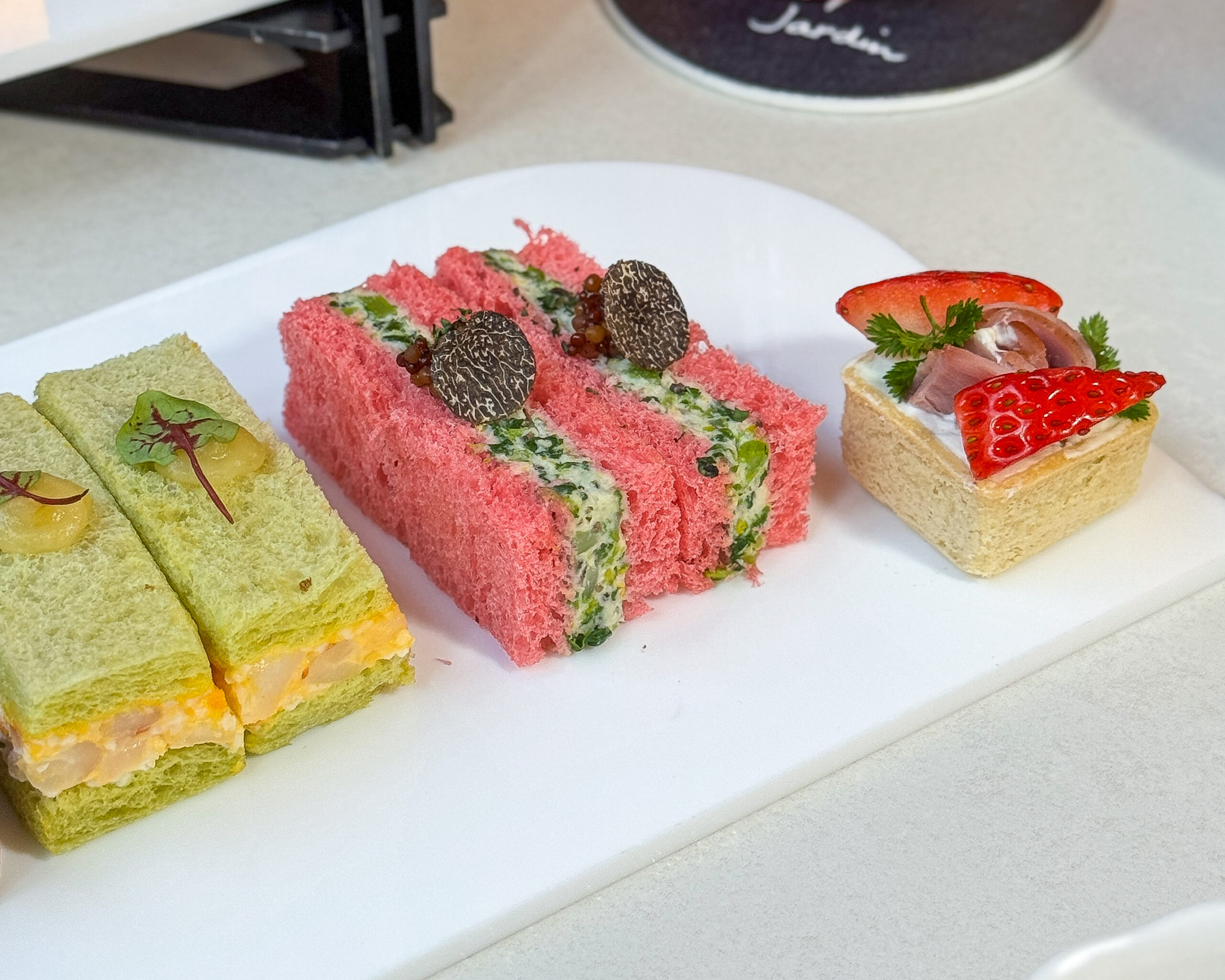 別皿ではイチゴの風味が魅力の「バスクチーズケーキ」がセットになっていて多彩なイチゴスイーツが堪能できます。セイボリーは具材が豪華なサンドウィッチや、冬に美味しい春菊のムースはキャビアの塩味と旨味で喉越し良くいただきます。