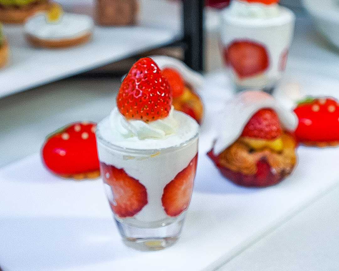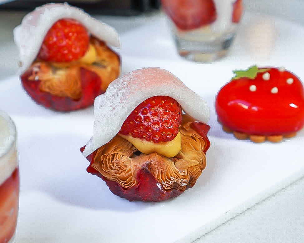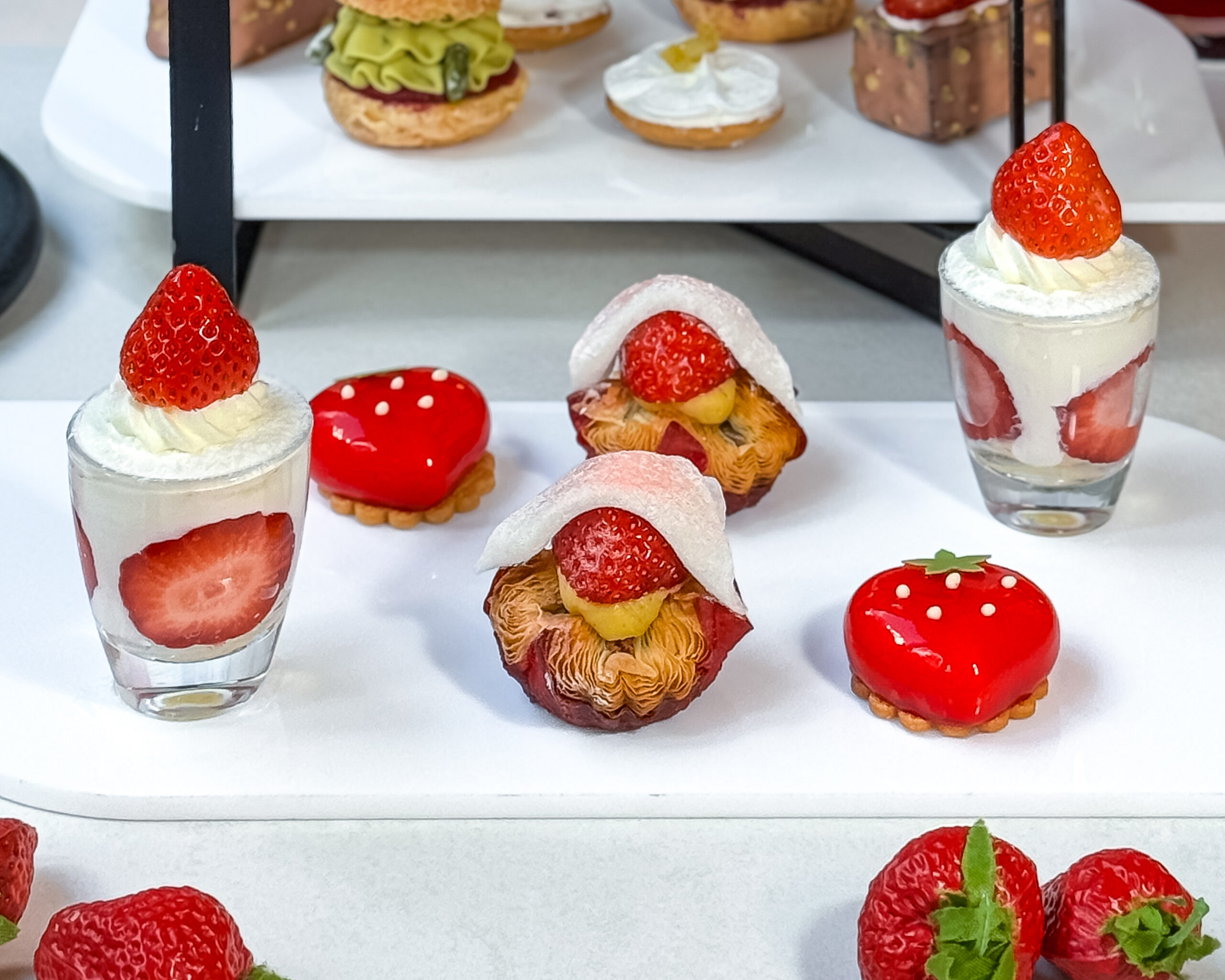 かろやかな口どけの「ストロベリーショートケーキ」は食べやすいグラススタイル、イチゴと相性も良く、彩りも美しいピスタチオと合わせた「パリ・ブレスト」、艶々のイチゴはストロベリージュレを忍ばせたホワイトチョコレートムース、ビジュアルも味わいも大満足。私はサクサクのデニッシュに苺と求肥をトッピングした「苺大福デニッシュ」がお気に入りでした!