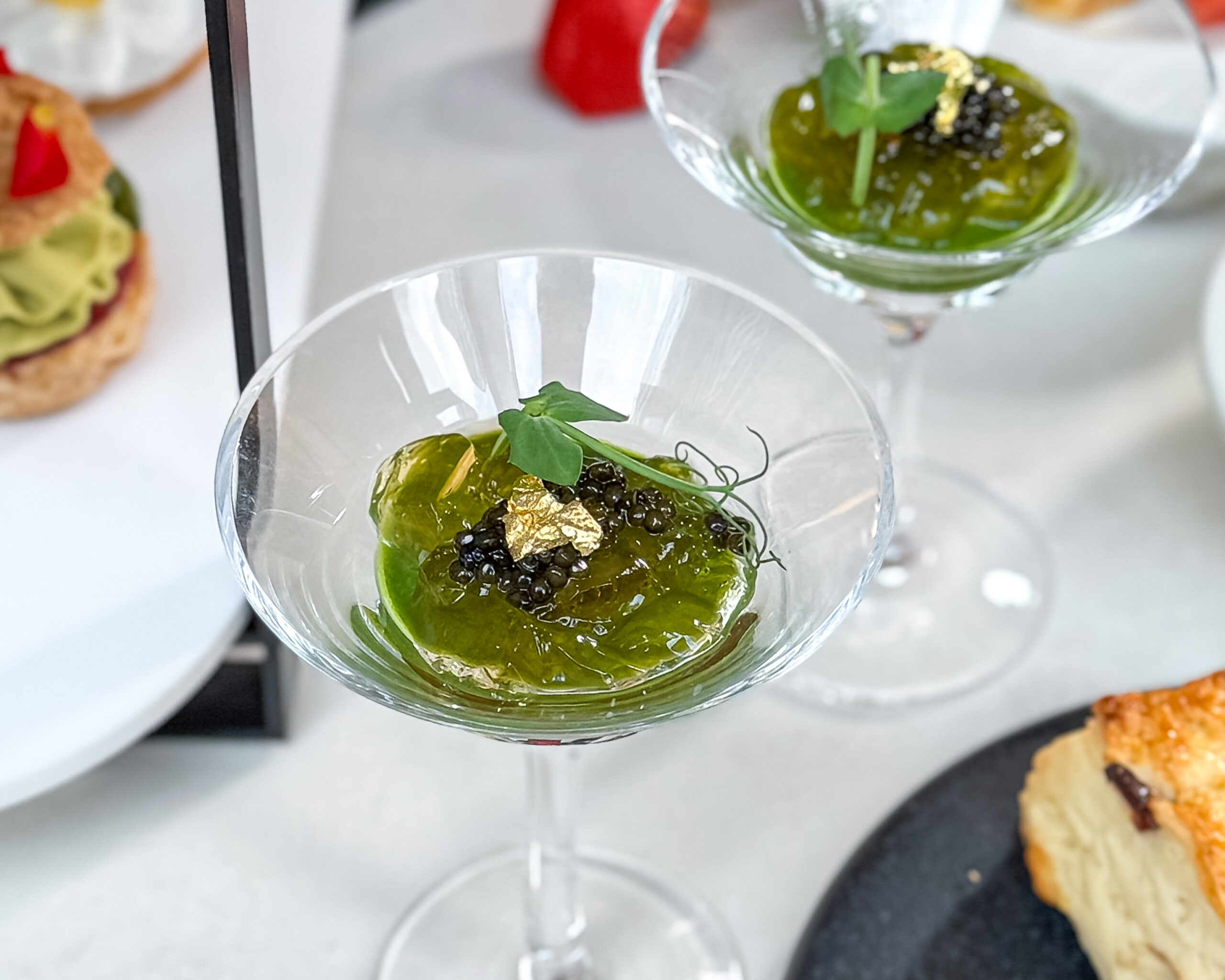 ・春菊のムースとオセトラキャビア、桜風味のコンソメゼリー