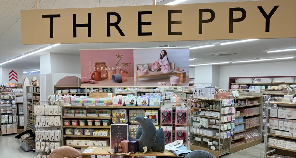 THREEPPYは、〝あいらしい。そして私らしい。〟をコンセプトに、100円ショップ「ダイソー」でおなじみの大創産業が展開するブランドです。店内にはダイソーの雑多な雰囲気とは一線を画す、温かな色使いとデザイン性のある雑貨で溢れています。