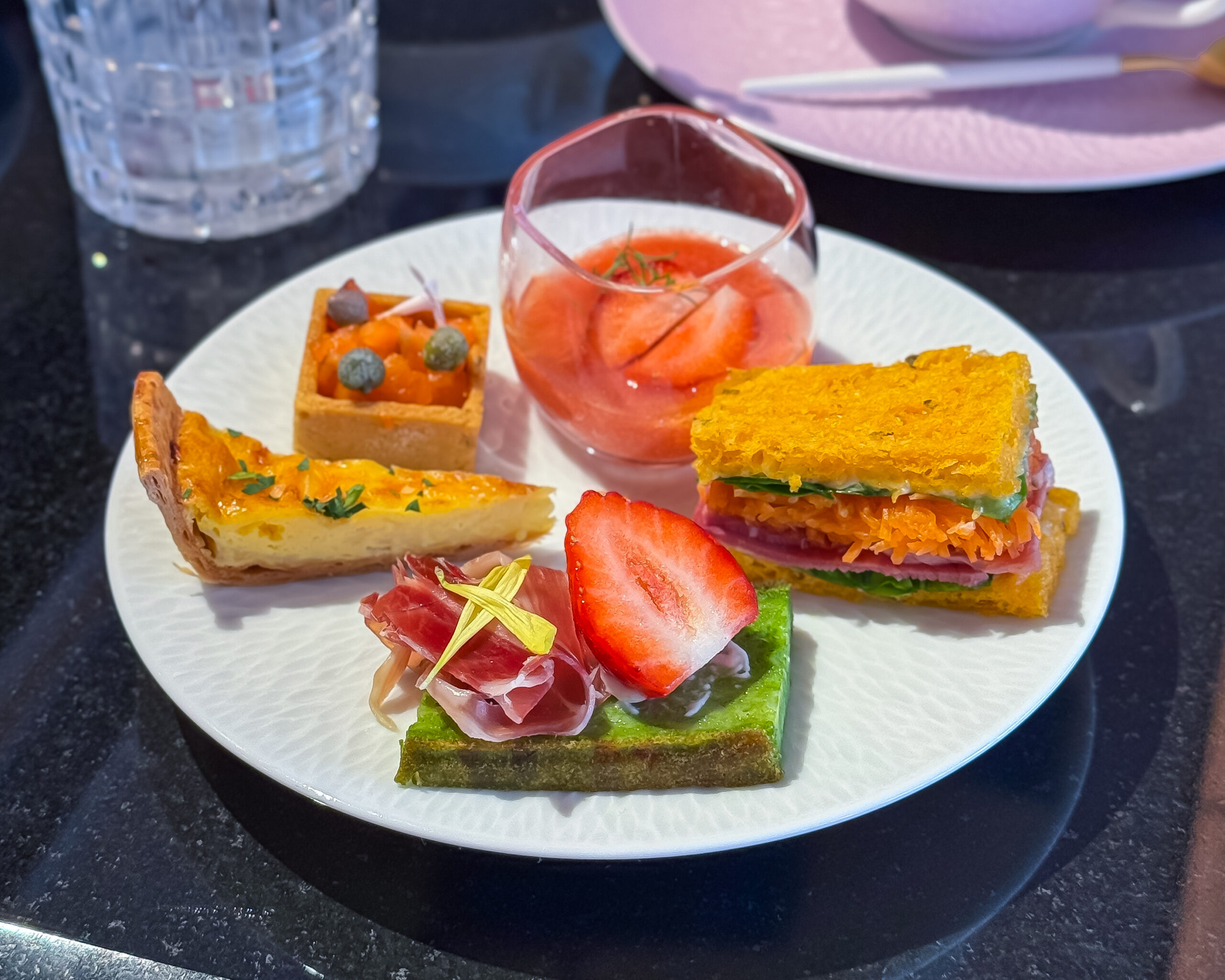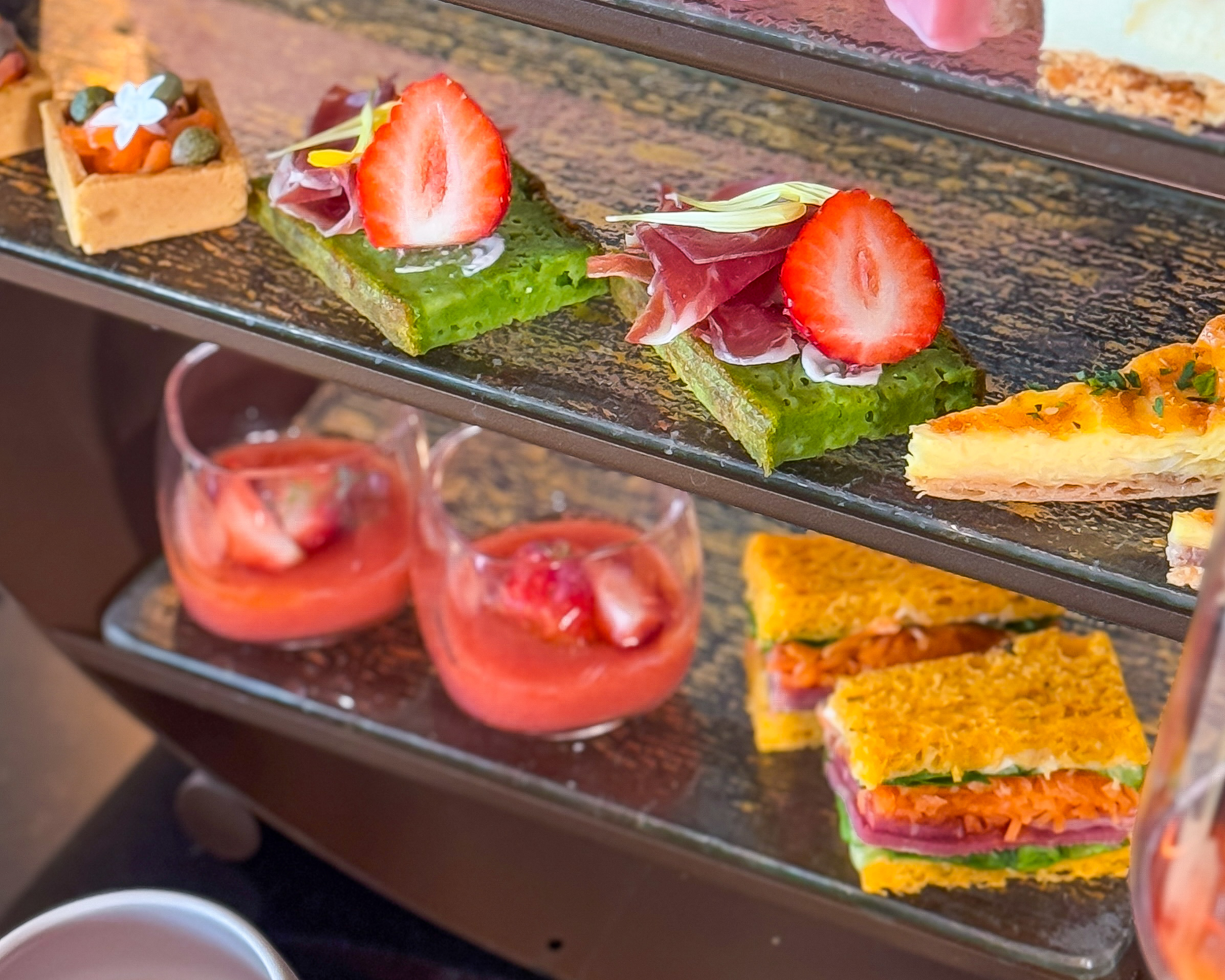 セイボリーでは、 あまおうとトマトのバランスが絶妙なスープや、 福岡県の明太子も使用し、 あまおう以外の福岡県のグルメも楽しめます。 パストラミと人参のサンドイッチは野菜たっぷりで見た目も鮮やか。 お味もとっても美味しかったです。