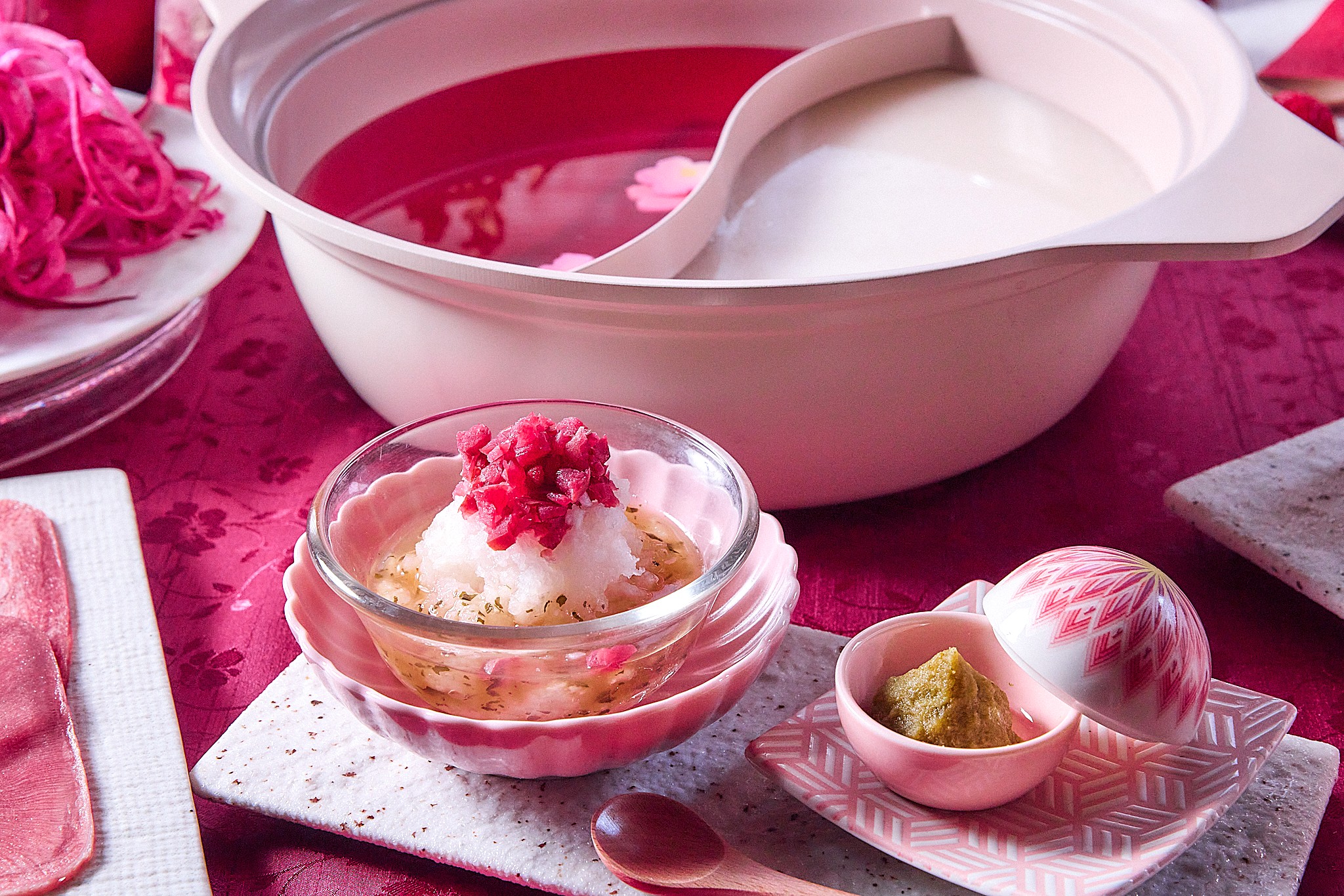 赤い大根「紅くるり」を梅だしに入れると、だしがほんのりサクラ色に染まっていくそうです。春の訪れを感じられそうなビジュアルが、心も体も温めてくれそうです。