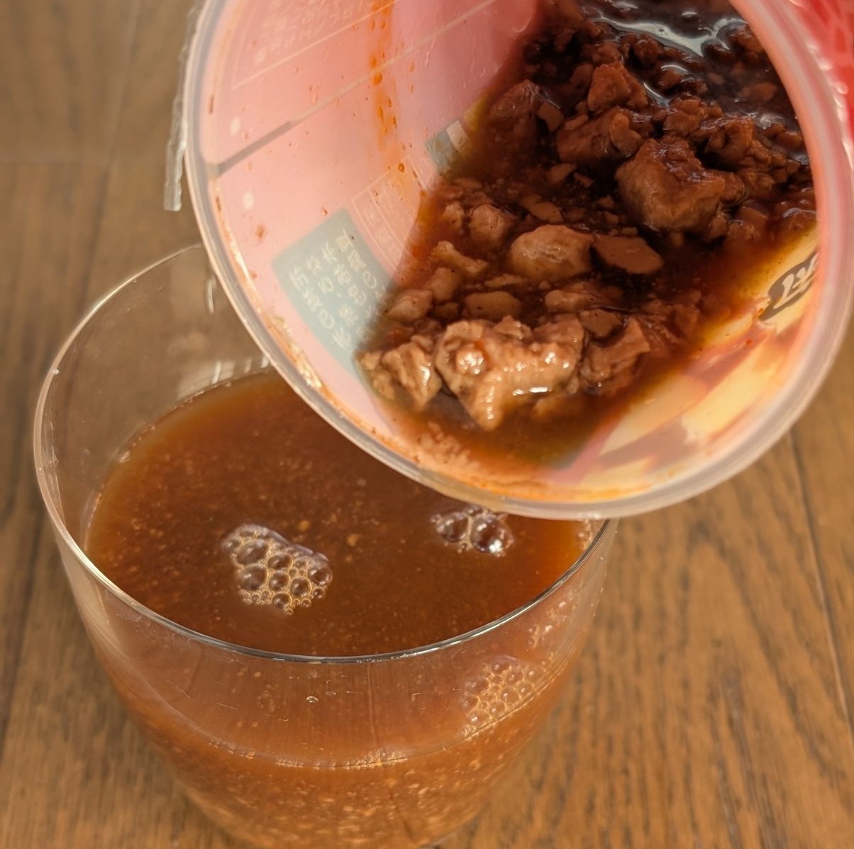 実際に透明のコップに入れてみると、見た目は具なしのブイヤベースのよう。でもそのスープの奥深くには、大豆でつくられたひき肉と豆腐がしっかり鎮座していました。