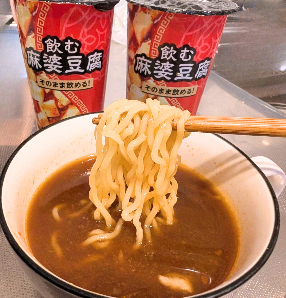もはや、手軽に飲めるコンビニドリンクの域を超えてしまいましたが、ここまでアレンジができるとは…。飲む麻婆豆腐を購入した方は、この麻婆ラーメン&豚肉投入までチャレンジして、味変(あじへん=味の変化)を楽しんでいただきたいと思います。