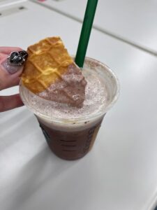 「どんな感じになるのかな」とわくわくしながら実際にディップしてみると、サクサクのワッフルの甘さとドリンクのほろ苦さが混ざり合い、また別のおいしさが楽しめました。