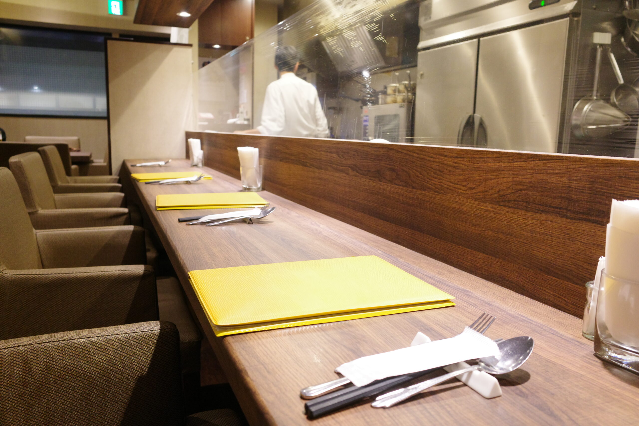 お席は、シェフの鮮やかな手さばきを間近に見られるカウンターが6席、そして2名掛けと4名掛けのテーブルが1つずつの、計12席という造りです。