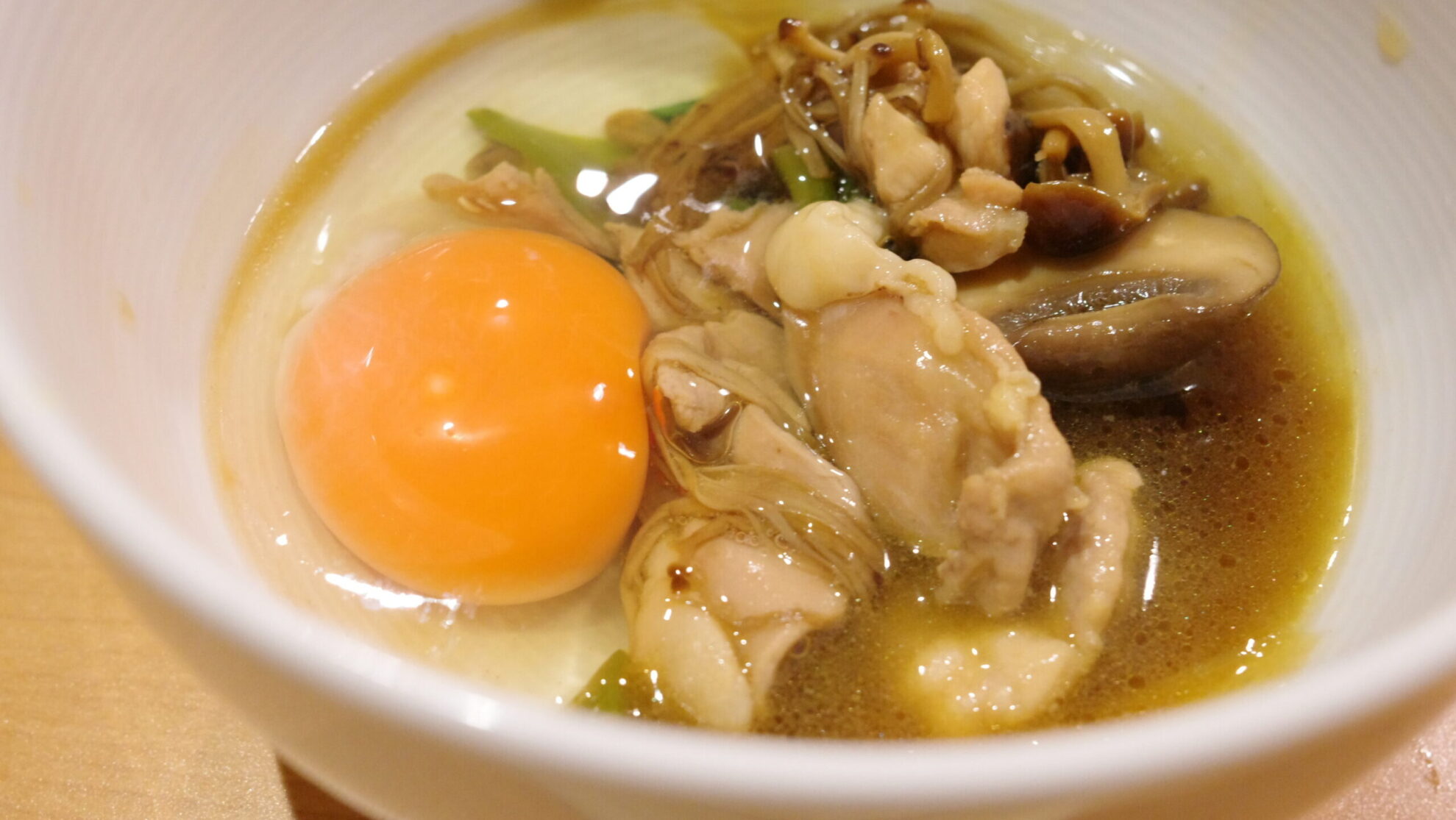 卵をさっと絡めてすき焼き風にいただく鶏肉は、まさに至福。