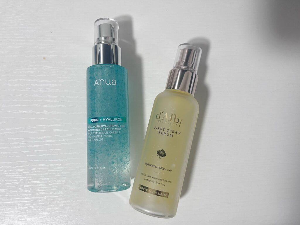 今回ご紹介するのは、最近SNSで人気となり、現在ポップアップイベントも開催中の「Anua(アヌア)」の「PDRNヒアルロン酸ハイドレイティングミスト」と、ミスト化粧水の人気の火付け役ともいえる「d’Alba(ダルバ)」の「ホワイトトリュフファーストスプレーセラム」です。