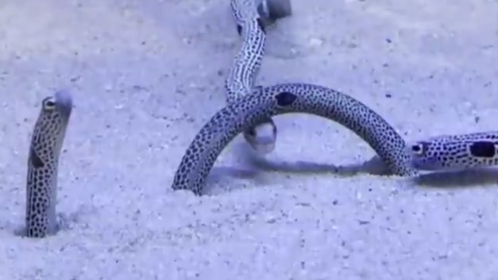 SNS担当によれば、チンアナゴの全長は20〜30cmほど。まさかのアーチ型は珍しい光景で、こうして動画を撮ったそうです。