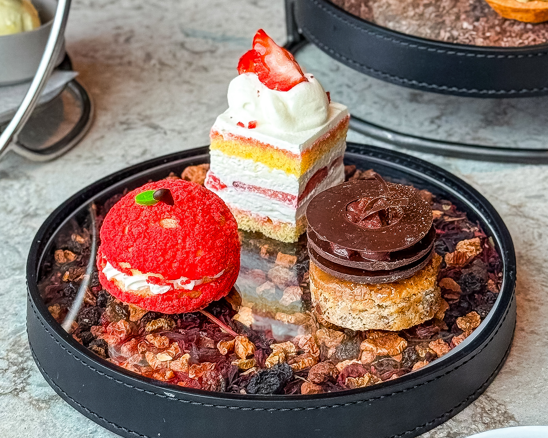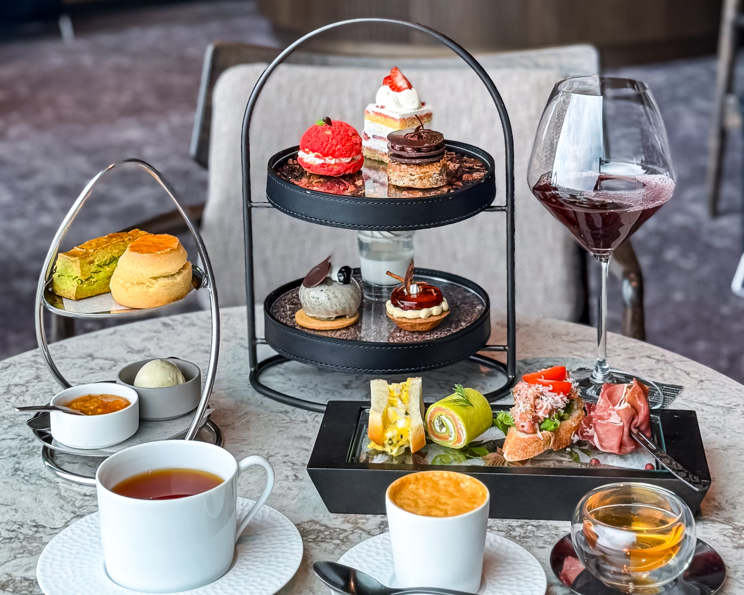 2段のケーキスタンド、セイボリーのプレート、そしてスコーンとコンディメント(クロテッドクリームなど)が乗ったミニスタンドが運ばれ、 テーブルはとても豪華!