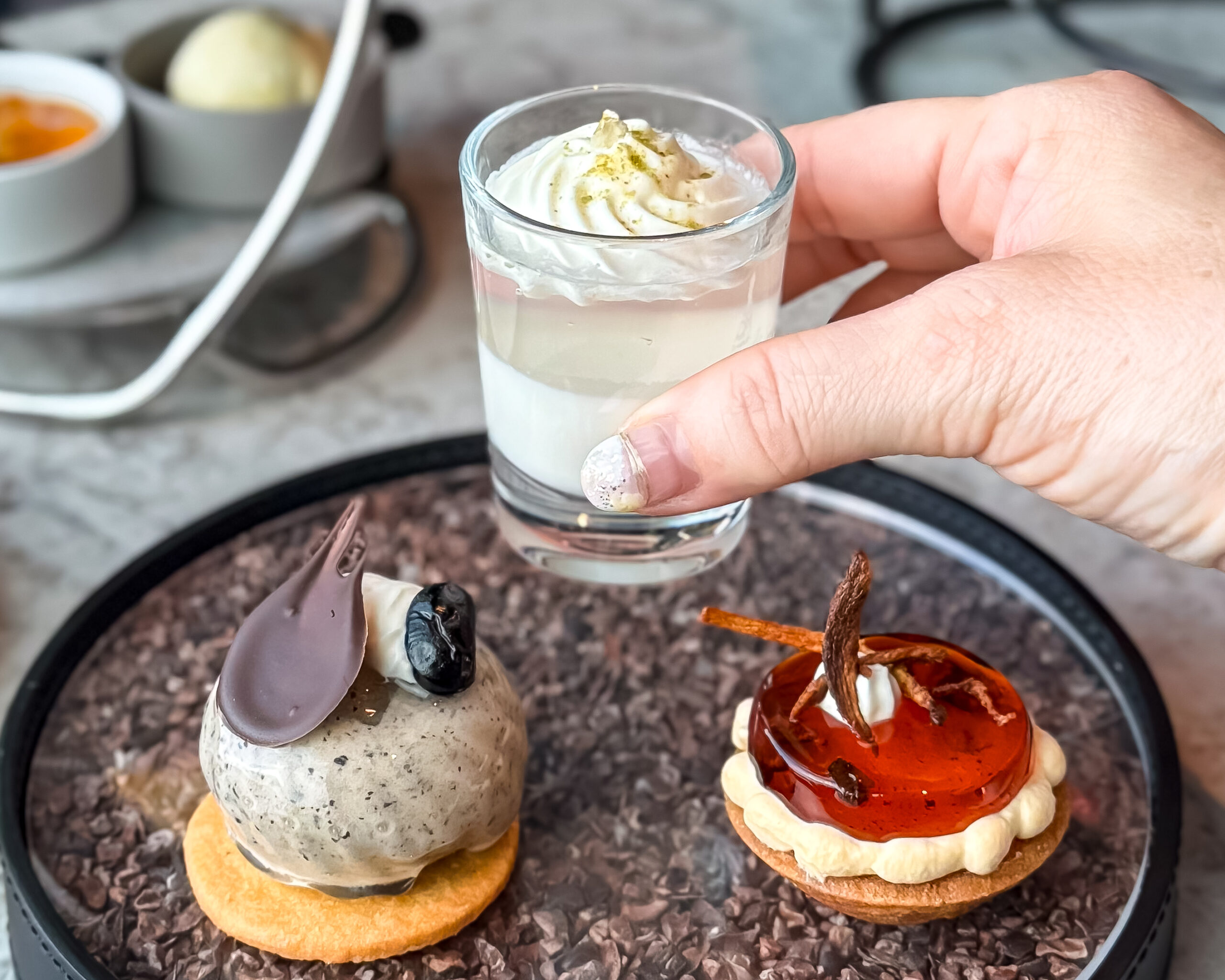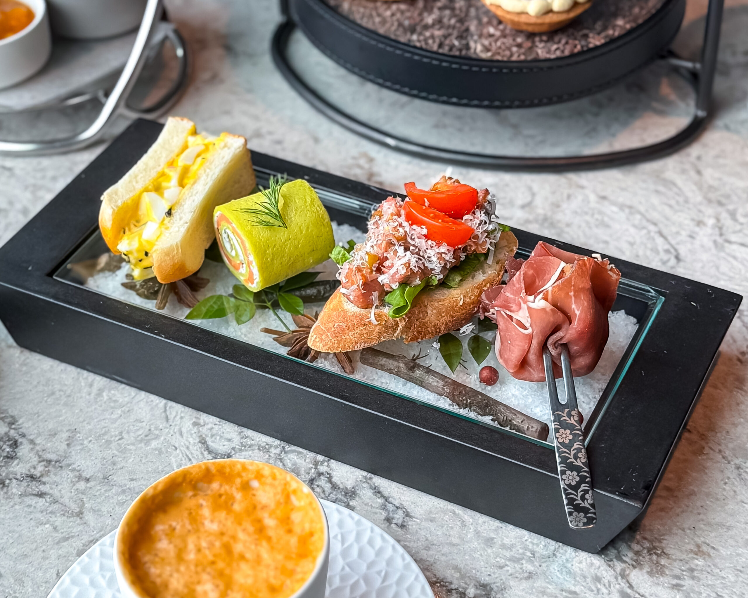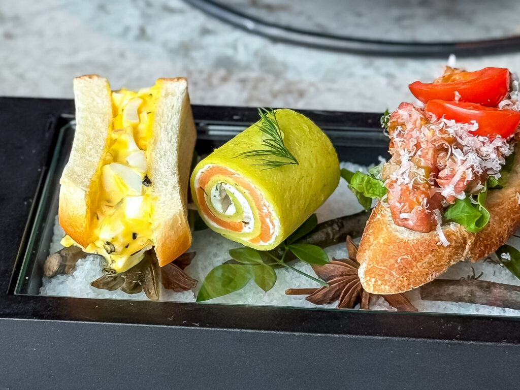 サンドウィッチは玉子にトリュフの風味が高級感を演出しています。スモークサーモンとフロマージュブランはクレープで巻いてあり、断面の美しさや食べやすさも良いですね。
