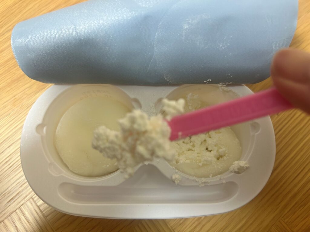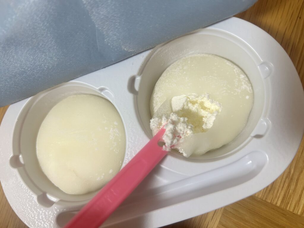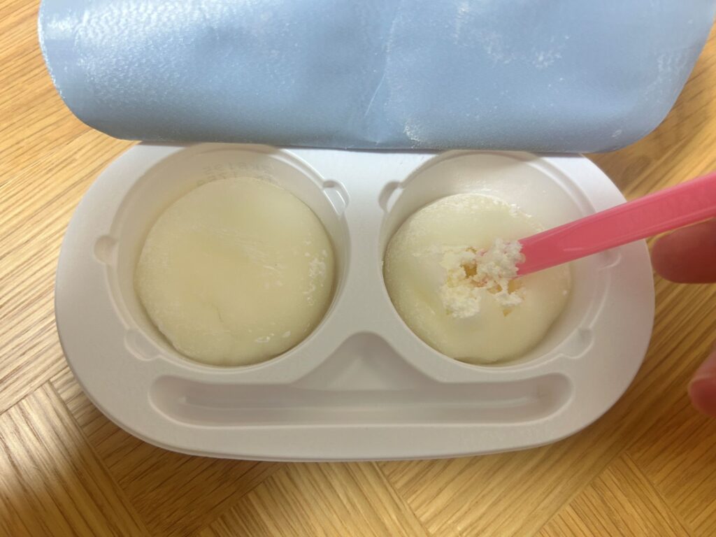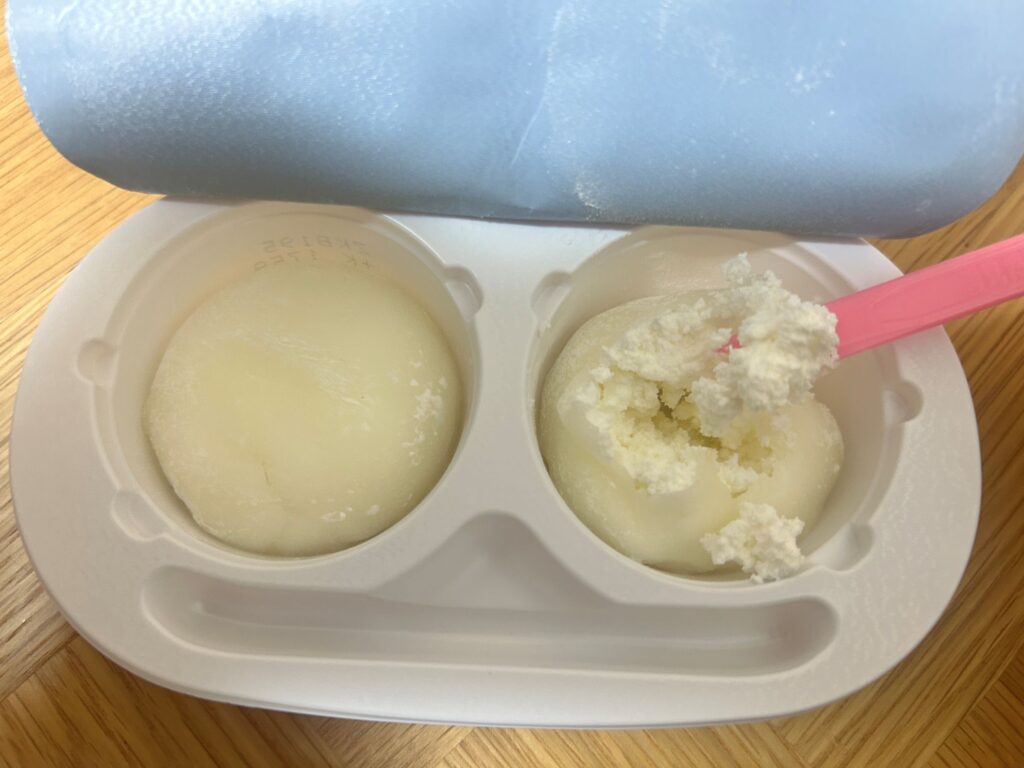 従来の雪見だいふくアイスも、カチカチ状態が解けてからは、柔らかくておいしいのですが、あの「ぎゅうひ」部分がムニムニ触感だとしたら、こっちはプニプニ触感とでもいいましょうか。