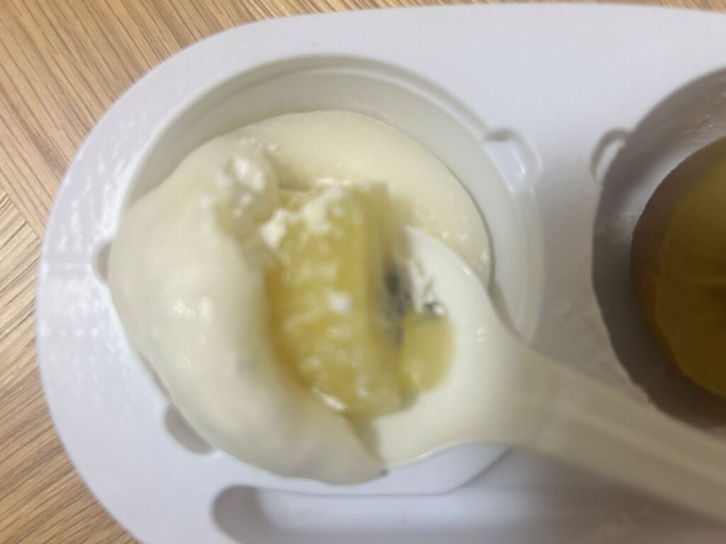 さきほどは、そ~っと伸ばしてみましたが、柔らか過ぎて、すぐに形が崩れてしまうため、クリームと大福生地は少しずつすくって、お口の中で混ぜ合わせる感じがよさそうです!