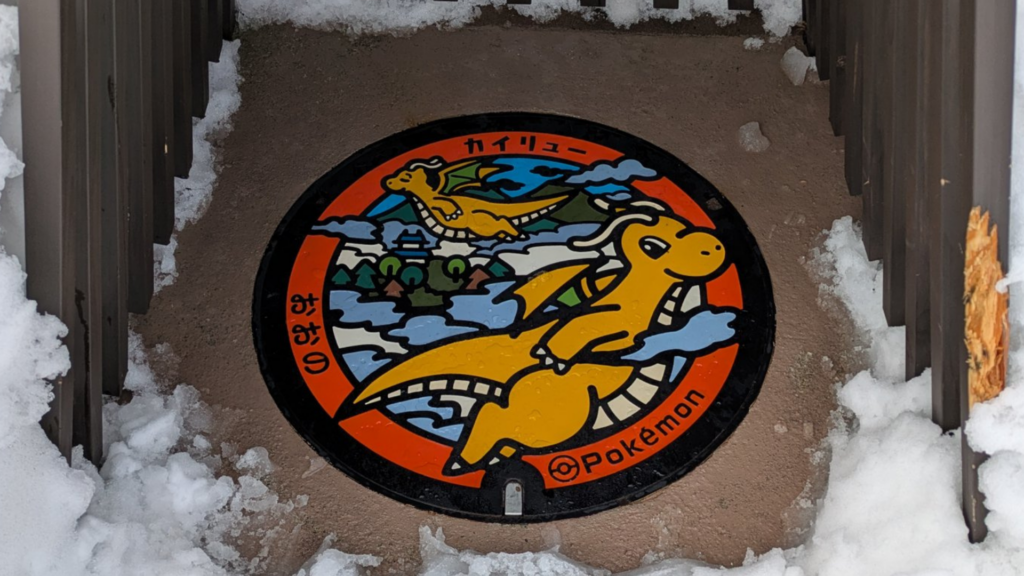 大野市のポケふたには、人気ポケモンの「カイリュー」が描かれていますが、写真では雪から守るように小さな傘のような覆いが設置されています。