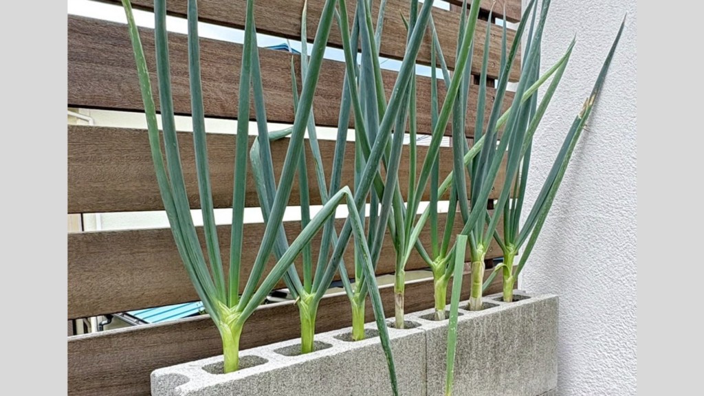 ぽたろうさんは、これまでにもこうした楽しい「容器栽培」を成功させてきました。例えば、コンクリートブロックの穴を使ったネギの栽培はこちら。