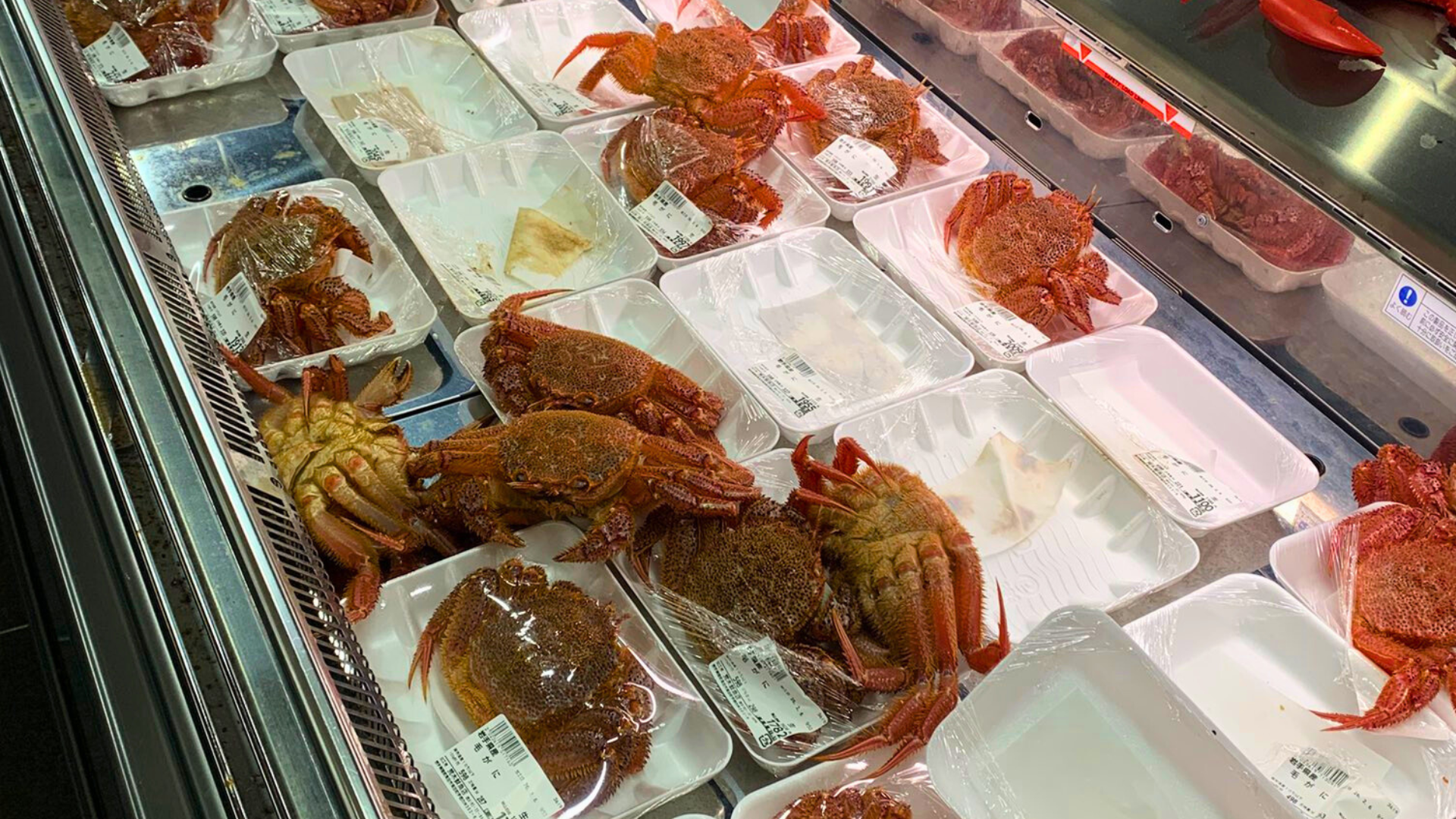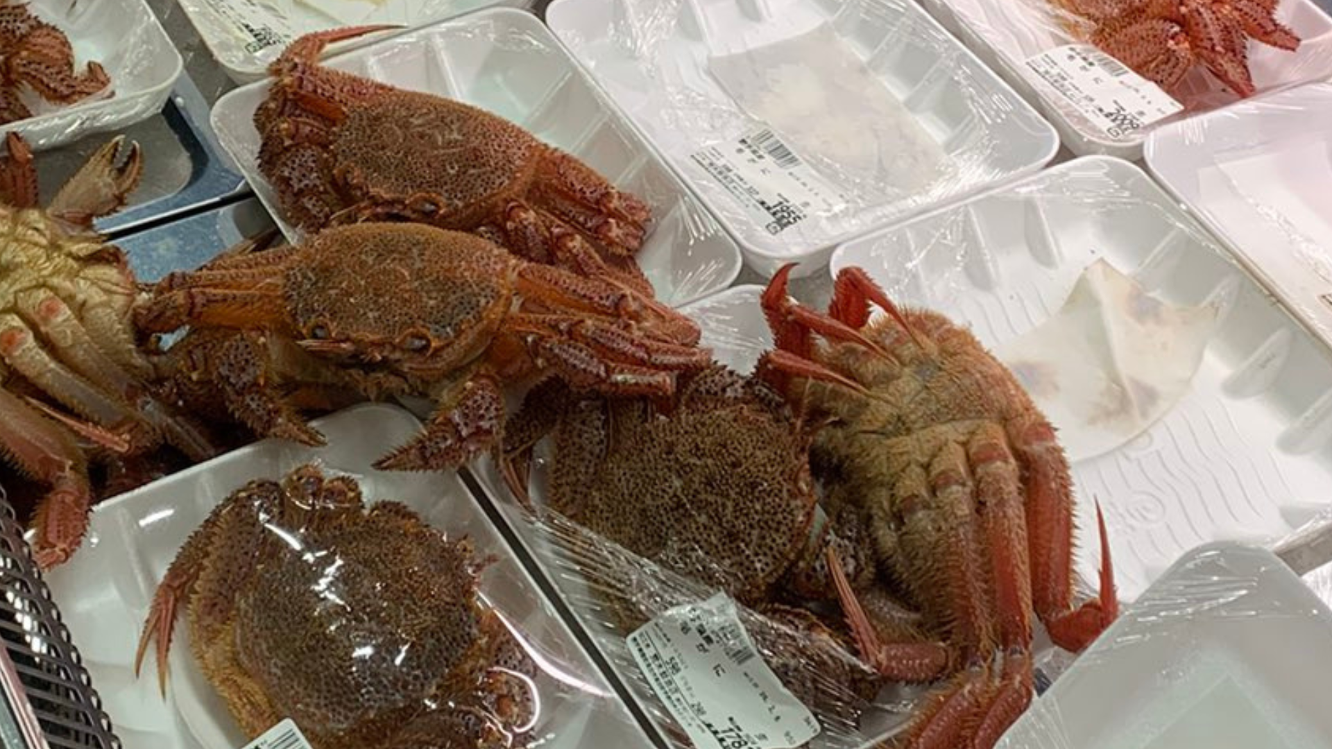 ショーケースを覗くと、一杯ずつ丁寧にパック詰めされた旬の毛ガニたちがずらり。しかし、よく見ると何杯かのカニが自力でラップを突き破り、外へとはい出しています。