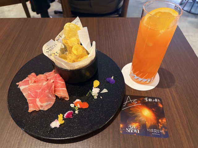 次に頼んだのは、楽曲とのコラボカクテル「向日葵花火」(税込み1,200円)と生ハム&黒トリュフチップスのフード「REAL PLATE 2」(税込み1,200円)。